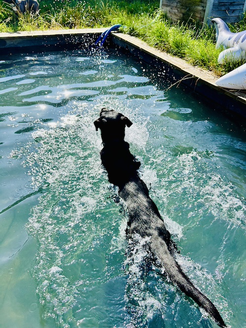 Hierbei haben wir über die gesamte Breite einen Einstieg in Form einer schräge geschaffen, sodass eure Vierbeiner und auch wir bequem ins Wasser gehen können. Den 6 Meter mal 3 Meter Pool halten wir mit einer Sandfilteranlage sauber, jeden Morgen überprüfen wir die Wasserqualität mittels Teststreifen.